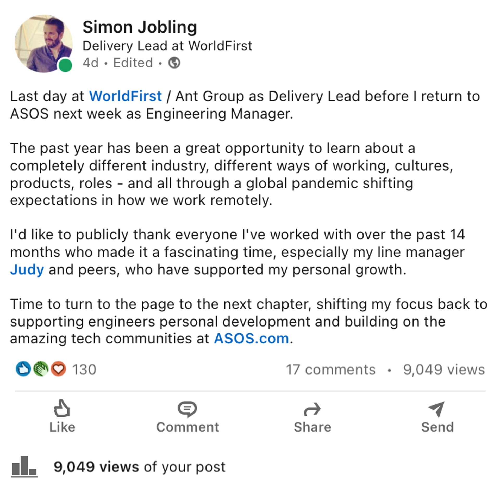 As I sent my leaving message to team mates, I decided to mark the moment with an impromptu Linkedin post thanking my WorldFirst peers and preparing for the ASOS crowd. Little did I realise how "viral" that post would turn out; as of writing this, it had over 9,000 impressions and 130 reactions. A combination of well-tagged company and people names and timing might have helped but definitely worth considering Linkedin for any social marketing based on this evidence.