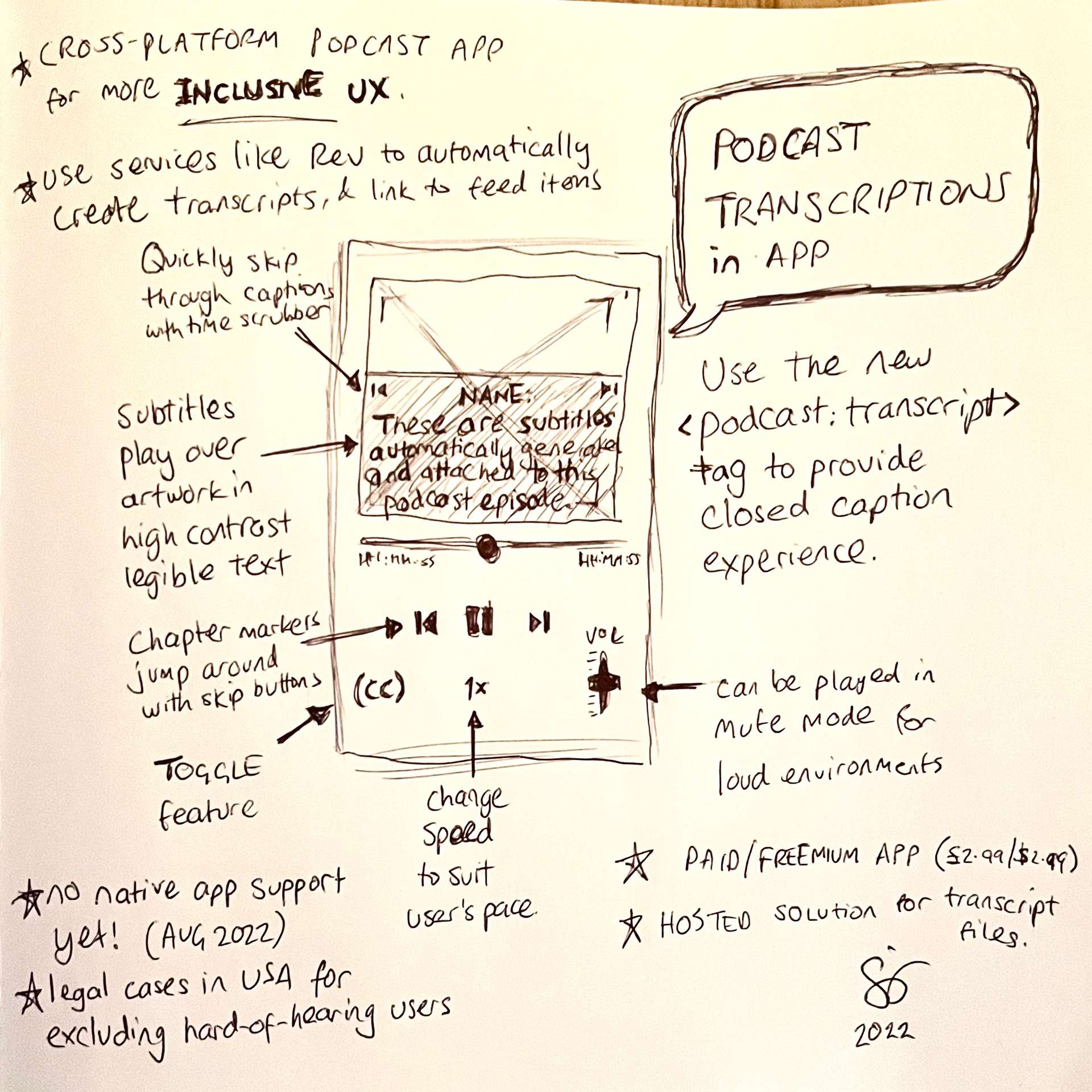 My product design displays subtitles over the artwork with additional functionality to bring subtitles to the core user experience such as quick navigation, speed and volume levels.