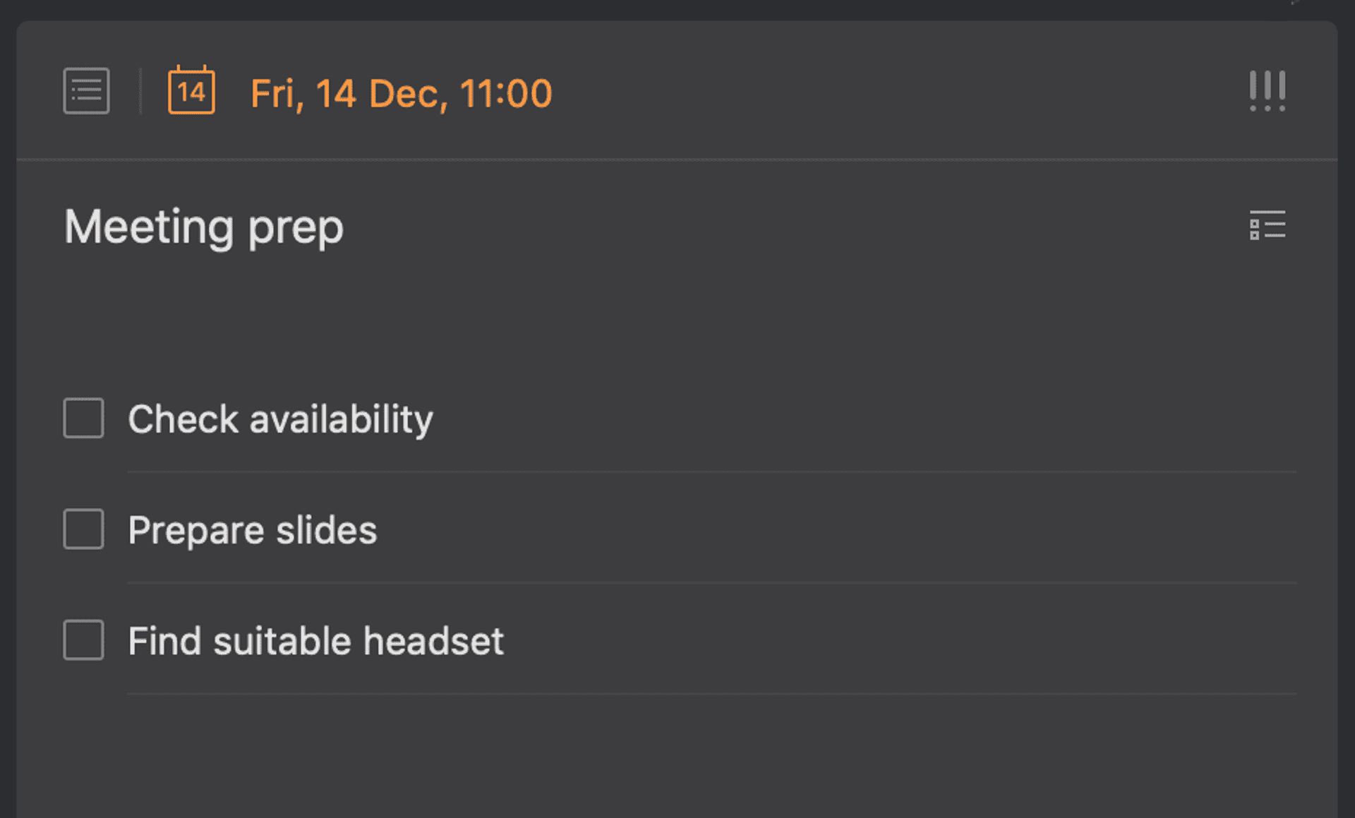 Secondly, it’s possible to create nested actions with sub-items. For example, say you’ve got to prepare for a meeting in a few days time, it’s possible to break down the actions like “Check availability”, “Prepare slides” and “Find suitable headset” within a top-level “Weekly Meeting” item. (The UI even shows a subtle progress meter in the background of the parent item on your main list - nice touch).