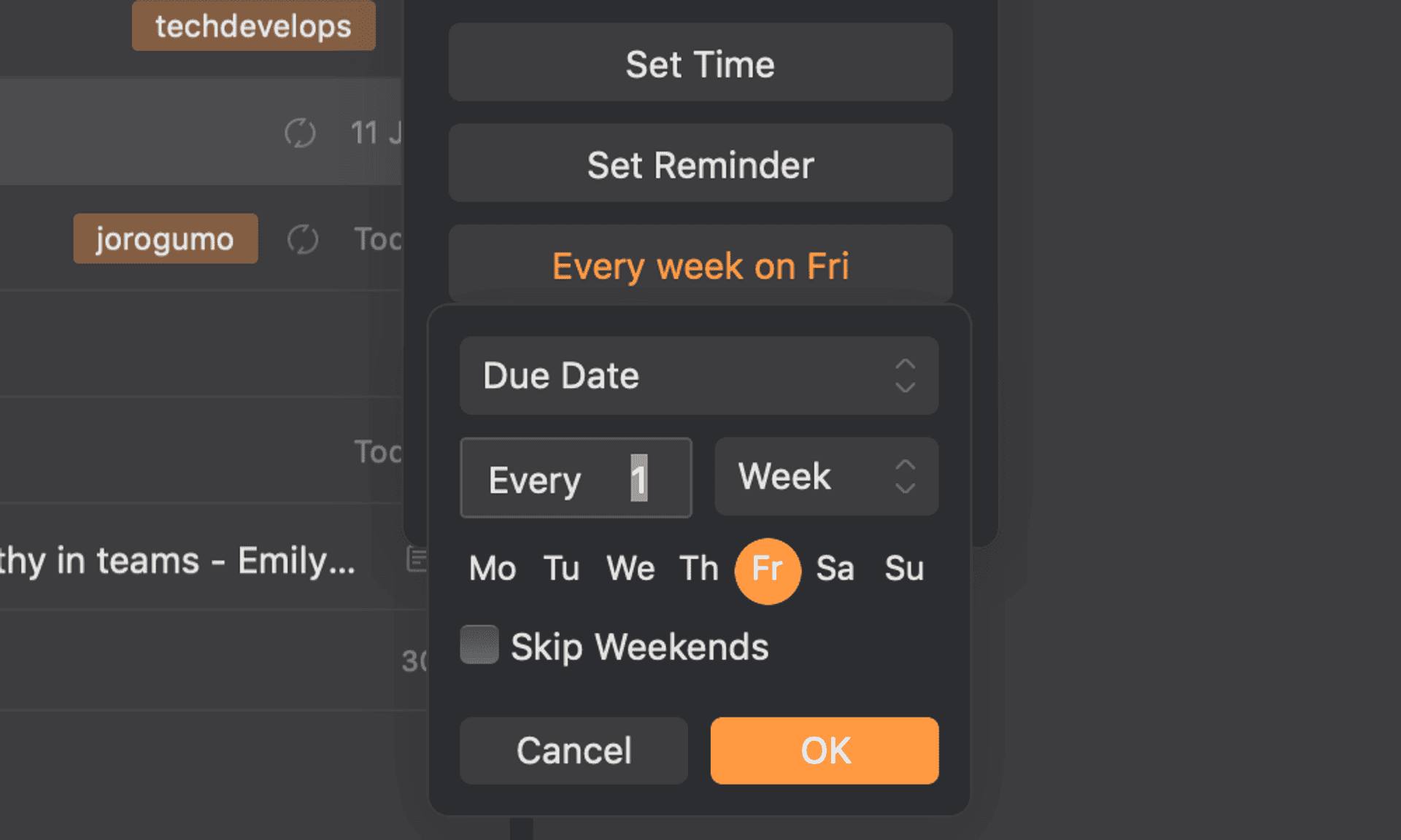First off, items can be repeated. This is a big win for me when I have regular things to do – updating stakeholders, weekly or monthly tasks like timesheets, fortnightly 121s. Setting the frequency is pretty versatile to suit your needs and it even tries to use natural language when you’re creating items (think “Check timesheets last Friday of the month” or “Team video-call every weekday morning at 9.30”).